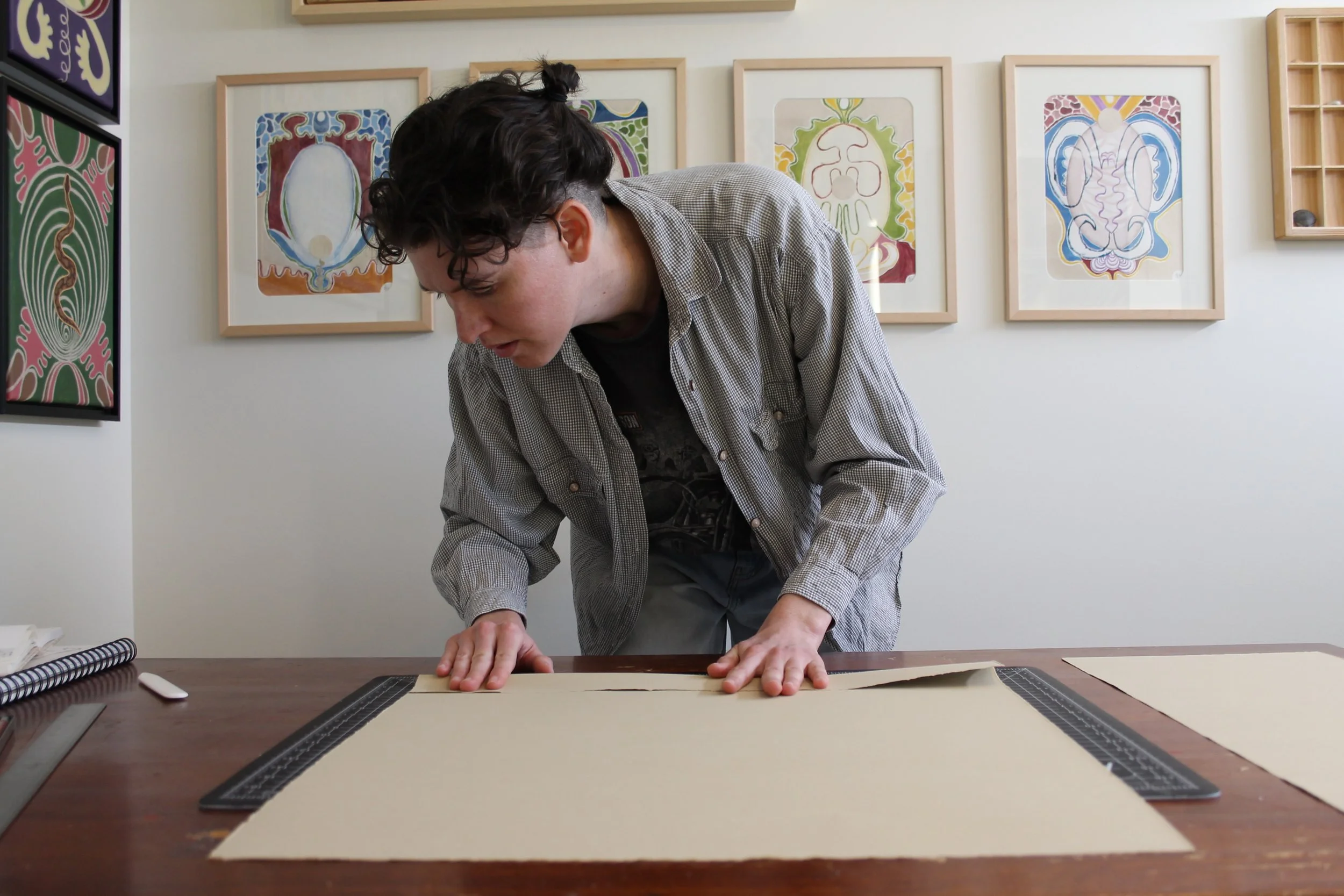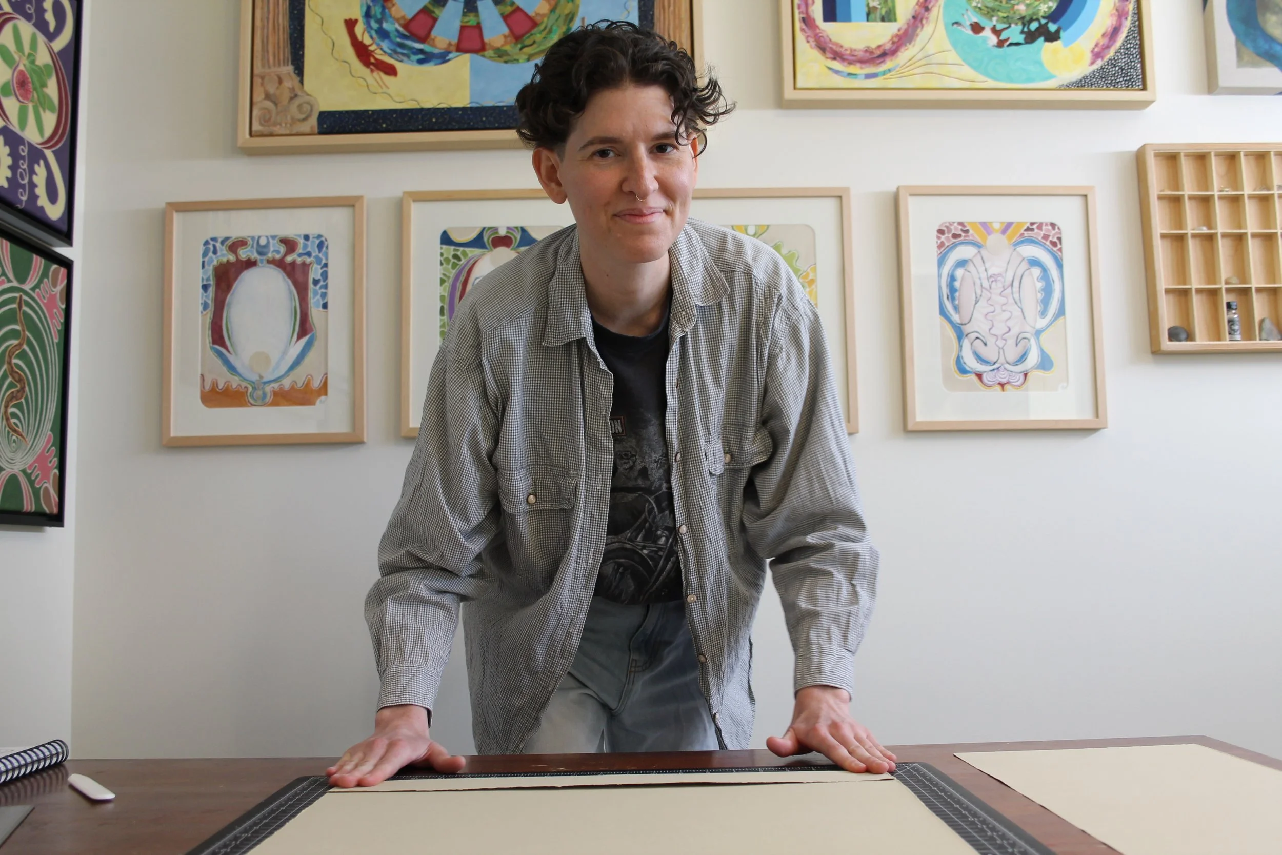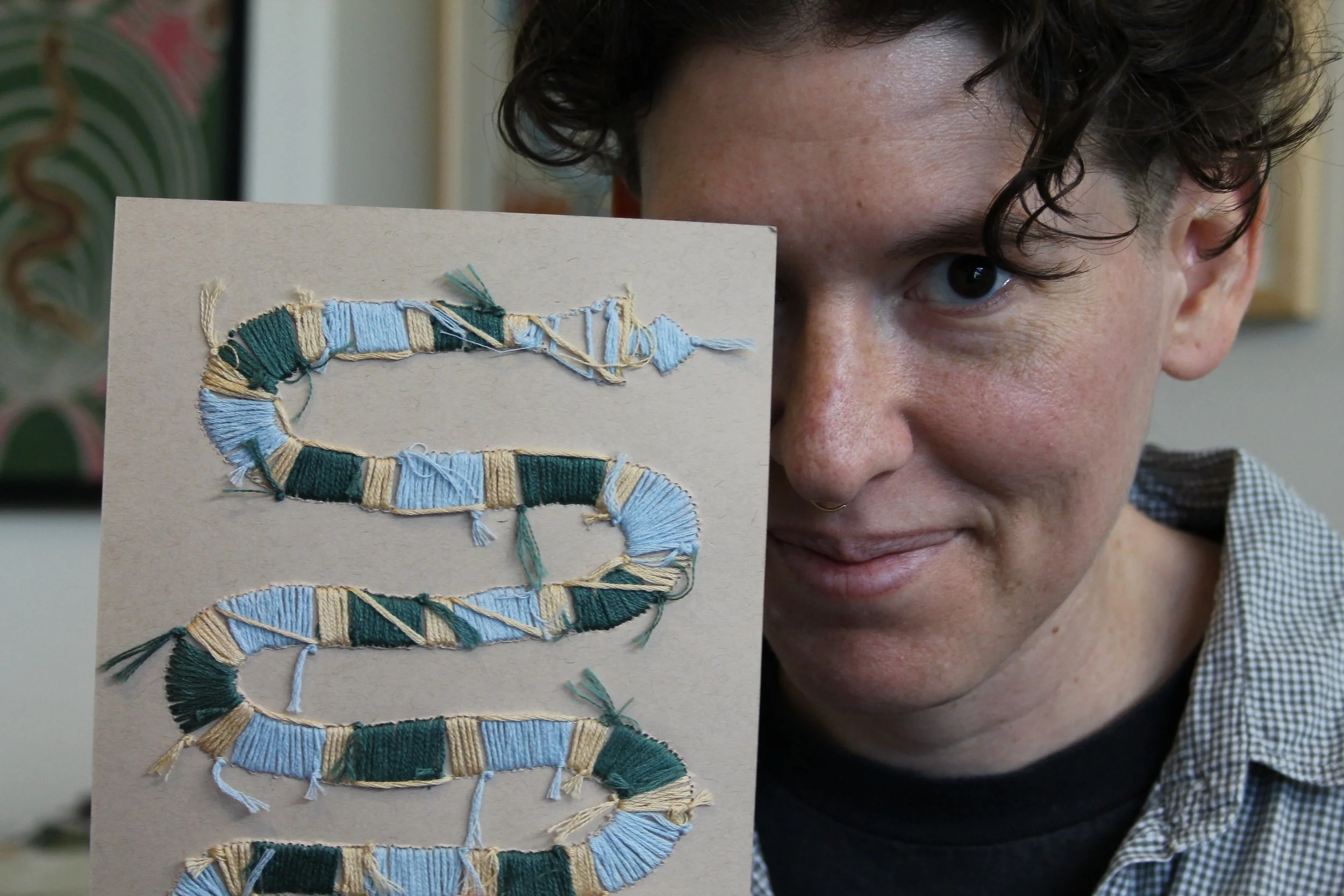 I play with how embroidery, water-based oils, printmaking, heavy-body acrylics or inks, penwork, three-dimensional paper layering, watercolors, and collage elements work together—whether that be on textile, paper, wood, or some combination of these.